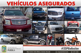 Asimismo, fueron aseguradas las siguientes unidades: camioneta Dodge Ram; camioneta Ford Explorer, modelo 2008, con placas de Puebla; camioneta Cadillac, con placas de Tlaxcala; camioneta Lincoln color blanco; camioneta Chevrolet, con placas de Puebla; camioneta Dodge tipo Ram, con placas de Baja California Sur; camioneta Ford tipo Ranger, con placas de Chihuahua; camioneta Ram 2500, con placas de Jalisco; camioneta Tucom, con placas de Puebla; motocicleta Ducati; motocicleta Itálika 250 y dos motocicletas marca KTM.